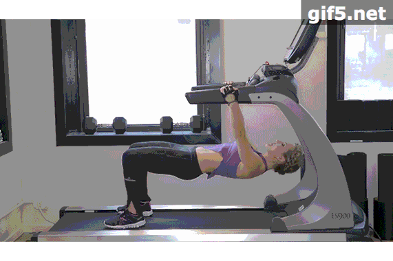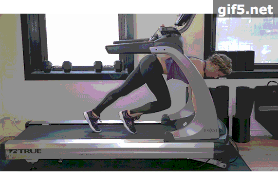 动作5:暂停跑步机,双手按在跑步机马达罩上。双脚向后蹬踩跑带。背部蜷缩,肩膀位于腰部之上,臀手下压。连续这个动作 2 分钟。
