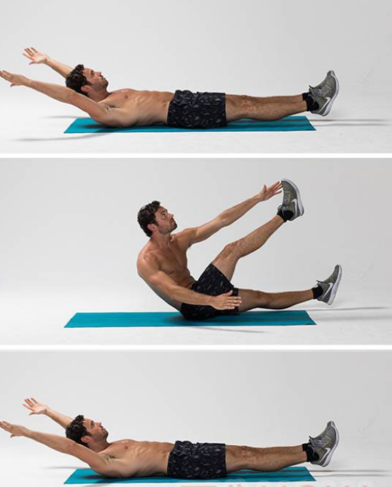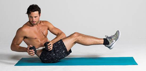 坐在地面上,;��双脚向上抬起,屈膝并拢,双臂各持哑铃一端置于胸前,以腹部力气坚持均衡。