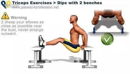 2 . 呼 气 , 两 肩 放 松 , 两 臂 慢 慢 屈 肘 , 身 体 尽 量 下 沉 ( 尤 其 要 沉 臀 ) , 稍 停 2 - 3 秒 。 在 身 体 下 沉 时 , 动 作 要 平 稳 , 始 终 控 制 住 肱 三 头 肌 慢 慢 下 降 , 直 至 感 到 肱 三 头 肌 充 分 伸 展 。