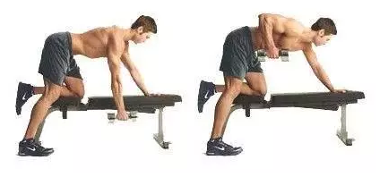 1 . 屈 体 用 正 握 法 抓 住 哑 铃 , 另 一 只 手 扶 在 长 凳 上 支 住 身 体 , 另 一 只 膝 盖 也 弯 曲 支 在 长 凳 上 , 身 体 几 乎 与 地 面 平 行 , 抬 头 挺 胸 。