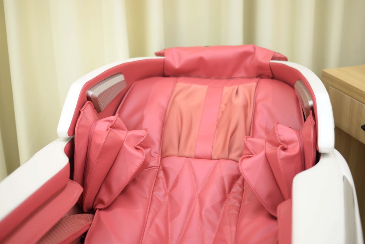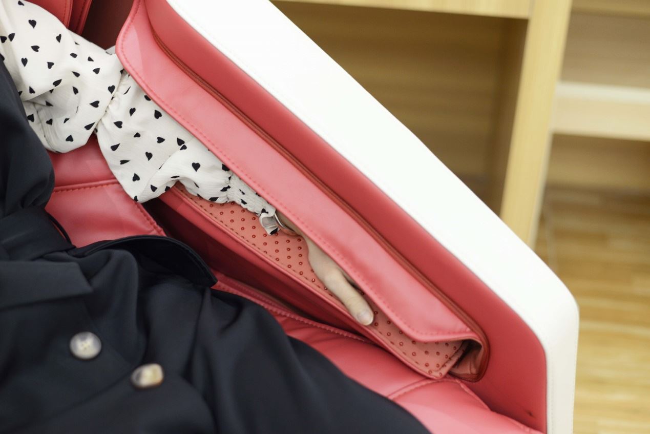 OG-7505的按摩气囊,分别分布在肩部、手部、和腿足部。笔者由于工作原因,每日伏案久坐导致肩颈时常一阵一阵的酸痛,这台按摩椅在肩颈处的气囊配合此处的按摩头把肩部牢牢固定,向后扳动的时候仿佛真的有人捏着肩膀向后开肩,按摩头通过揉捏推拿僵硬斜方肌,直击此处的酸痛点,整个过程舒爽畅快。