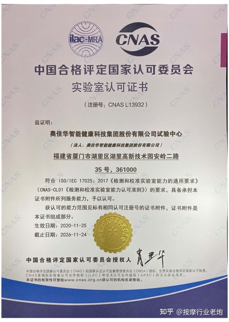 奥佳华公司很重视研发,公司拥有的专利数量是整个按摩器行业最多的,累计获得技术专利1093项。公司研发实验室还获得CNAS国家实验室认可证书,是行业内唯一一家获此国家级认可评定的企业,还是国家按摩器行业标准制定的组长单位,论专业度,行业翘楚。