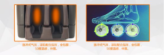 富士AS980配有多功能包覆式气压按摩,全包覆按摩,配有加热功能,热敷加温可达到50度,全程呵护你的腿部,配合脚底舒适的滚轮按摩,使按摩舒适感加倍。