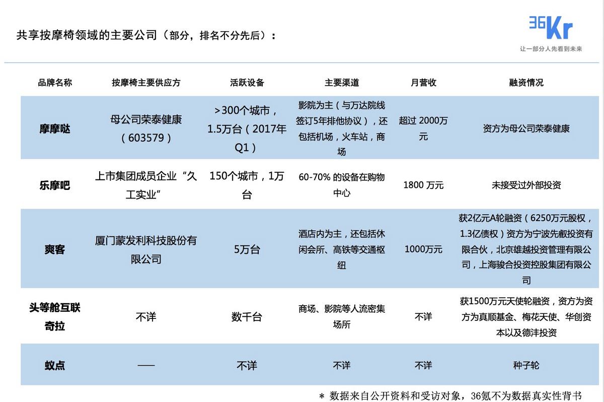 可以看出,这个领域从一开始就有不少大企业入场。比如摩摩哒就是母公司荣泰健康在去年打造的新品牌(新公司名为稍息科技)。荣泰健康本身是国内按摩器具龙头企业,其年年报显示,2016 年按摩椅销售额11.67 亿元,同比增 36.3%。据了解,2016 年铺设的 1万台共享按摩椅已实现盈利?;贡热纾偷耐蹲史奖旧硪彩谴笮桶茨σ紊Ъ?。
