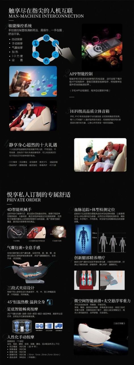 智能手机可实现与按摩椅的无线连接,进行远程下载升级APP控制软件,更能无限更新按摩程序,将按摩体验提kmr豪华太空舱按摩椅升至全新触感世界。robot按摩椅价格