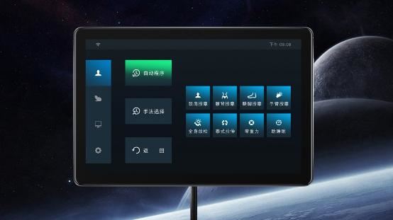 如今,星河按摩椅已经完全实现了PAD触屏操控。只要用手指轻轻一点,就可以实现开启按摩椅,选择按摩程序和按摩手法的操作,还能实现调节按摩力度大小,气囊力度,零重力角度以及腿机升降和伸缩等操作。