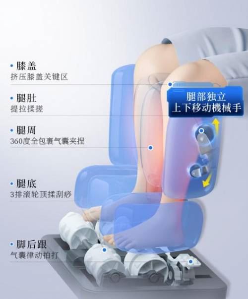 腿部配有独立的按摩手。EMS脉冲气囊360度完全包裹小腿和膝盖的关键部位。按摩手从脚踝向膝盖内侧上下移动。按照医学研究程序,抬起、拉动、揉捏悠悠球冰冷的腿肚,深度刺激三阴交等关键部位,释放腿部压力,帮助增强身体免疫力。