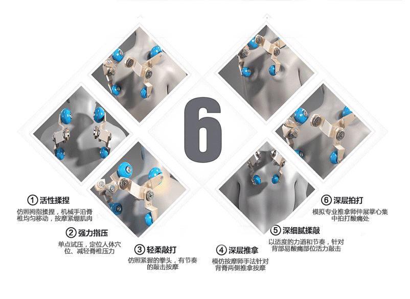 模仿专业按摩师的技巧:[主动揉捏]、[强力指法]、[轻柔叩击]、[深度按摩]、[深层细致揉捏][深度叩击][给你一个舒适的按摩体验!