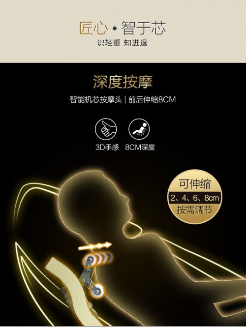 荣泰推出的RT7708按摩椅是中高端按摩椅市场的又一战略布局。配有rck按摩椅的第二代3D智能运动按摩头可前后伸展8cm,实现深度按摩。它还可以根据人体背部曲线自动调整按摩头的伸展。按摩头采用硅胶制成,弹性好,寿命长,柔软贴近双手,为客户带来更好、更舒适的按摩体验。