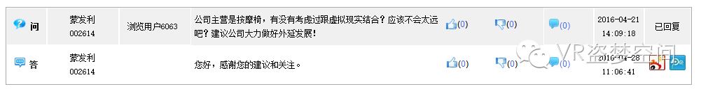 而itsu按摩椅 韩国按摩器具行业龙头企业之一厦门蒙发利公司,近期也传出在虚拟现实领域有所动作。从蒙发利各投资者互动平台上,可频频看到有投资者基于虚拟现实领域进行发问和提出建议,可见多数投资者对按摩椅+VR的前景看好。而我们从公司内部人员处了解到确实有所传闻,但都表示不清楚具体内容方向。我们致电了蒙发利公司,也没有得到确切答复,但并没有否认这个传闻,看来需要时间来确认了。