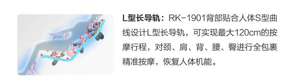 RK-1901禅修静心推拿椅后背采取 超长L型导轨推拿 可以或许根据人的身体后背S型变化深刻切近推拿,机芯可以走到臀部、年夜腿底下,导轨紧合人的身体曲线,推拿后果更精准到位,刺激后背穴位,规复人的身体性能。