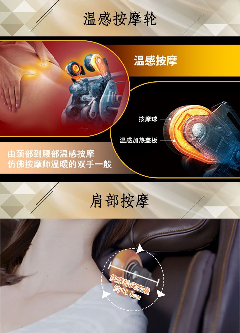 3、 内置9种主动推拿法式:揉抚懈怠、揉捏舒压、深度指压、全身伸展、肩颈重点、高速程式、上背重点、躯干重点共,推拿强度和蔼压强度也可以自行调整。