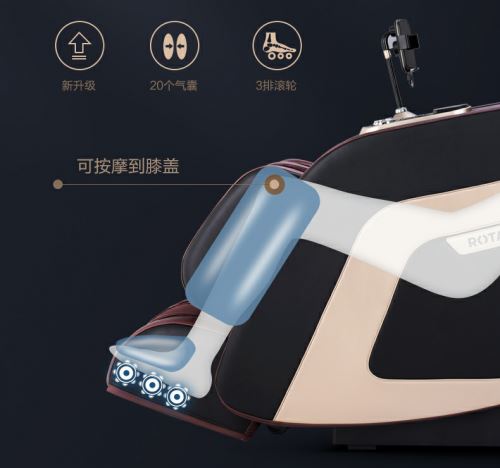 腿足按摩方面荣泰RT6810S按摩椅小腿按摩加高至膝盖,腿足20个大功率气囊进行包裹式节奏按摩,按摩更加到位。另外,足底滚轮升级为3排,全面覆盖脚底穴位,有效舒缓足部肌肉疲劳。
