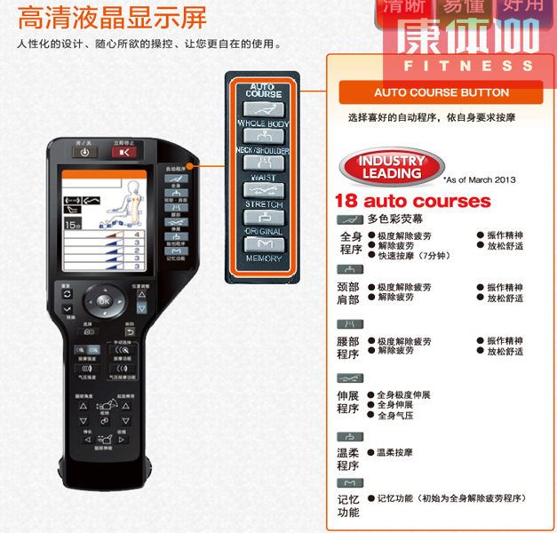 18种自动按摩程序,针对不同部位有不同的力度手法,无论您选择哪一种程序都能带给您不一样的享受,可能是放松舒适,可能是振作精神,也可能是极度接触疲劳。人性化的一键操作,随心所欲的操控,让您用的更自在。