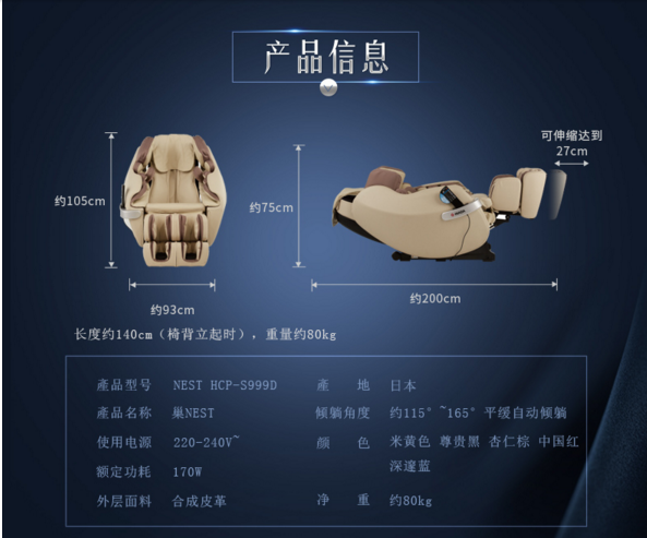 “稻田S999按摩椅是日本全进口产物,该产物聚集了稻田几乎所有的最新技巧,除了由几位日本顶级针灸医疗年夜师为这款按摩椅参加的焦点医学法式、可精准勘测穴位的智能侦测体系外,像8轴人工智能4D机械手、游马队智能穴位探测、55°倾斜式滚轮轴、手臂回血按摩、围绕按摩功效等,都是稻田细心研发的业界开创技巧?!钡咎锸谐「涸鹑吮硐炙?。