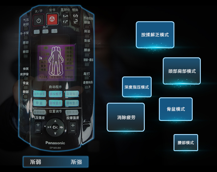 松下高端按摩椅EP-MA8K全身拉伸,伸展筋骨,舒展身材。经由过程按摩轮向前方置顶和两边气囊按压肩膀来到达肩胛骨舒展技巧;经由过程腿部多方位气囊的合营以及腿部高低移动来到达腿部舒展技巧;经由过程按摩椅面的气囊来到达骨盆舒展技巧,以及完成全身恬静的拉伸技巧。