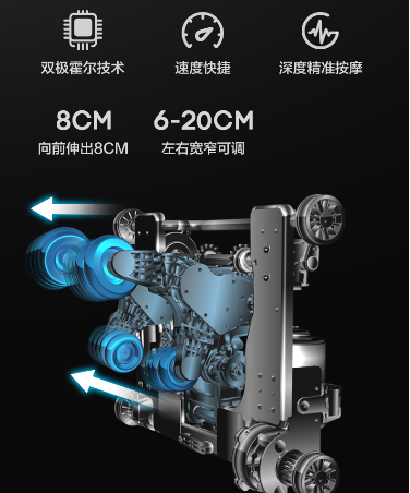 7、应用二代3D机芯,125公分超长SL型导轨,从耳朵后边风池穴直达年夜腿承扶穴按摩,宽中窄3档可调节,76个气囊全成分布,计数精准检测肩部地位,脚底三排滚轮刮痧按摩。