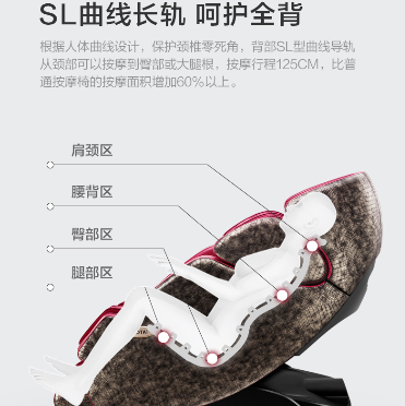 这款7709得到SL曲线长轨,爱护全背依据人的身体曲线设想,掩护颈椎零逝世角,背部SL型曲线导轨从颈部可以按摩到臀部或年夜腿根,按摩旅程125cm,比通俗按摩椅的按摩面积增长60%上述。