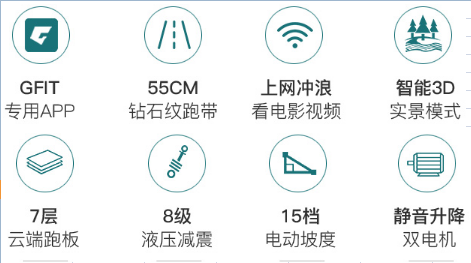 采取 55厘米黄金跑带,液压8级减震,静音降噪。15档坡度电动调节,承重150KG。