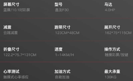 鑫友F30的可连续输出马力是1HP,跑带区域尺寸是123*48cm,跑步机最年夜承重是130公斤,属于固定坡度,虽说峰值马力标注4hp。