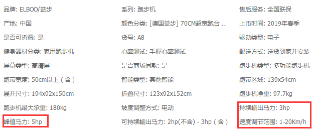 许多跑步机遇标注双马达电机,并且峰值功率4.5HP,这里的4.5HP只象征的是这台跑步机的峰值动力,而峰值动力仅仅是启动时跑步机最高运作下的动力。故此说,电机的峰值马力只能作为参考,并不是一台家用跑步机的真正马达功率值,咱们要看的是其连续马达功率。好比下图的亿健8009所示: