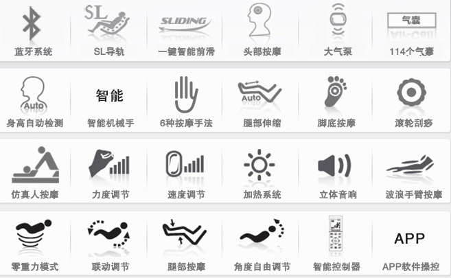 4、蓝牙衔接:内置蓝牙通讯???,可与用户蓝牙装备配对,播放歌曲,更供给遥控APP,让您轻松经由过程智能装备操控按摩椅。