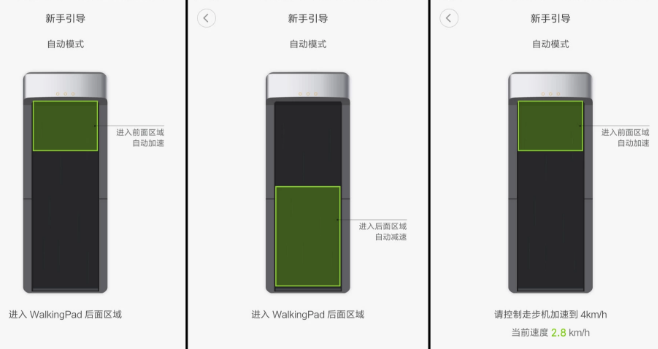 与主流跑步机分歧,小米走步机速度较低,得到自顺应速度掌握体系的专利技巧,自顺应速度掌握体系将走步带分为三个区域。从跑步机显示功效部位外后,依照 前1/3机身为主动加快区,叫区域一;中央1/3机身为主动定速区,叫区域二;后1/3机身为主动减速区,叫区域三。