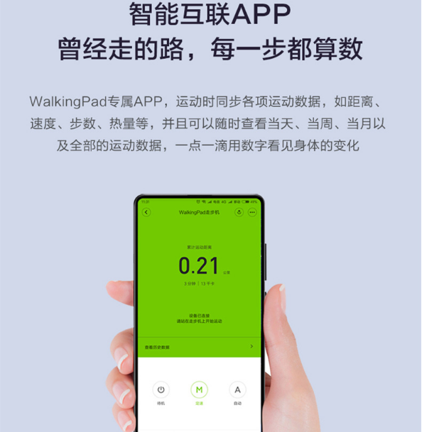 WalkingPad A1 Pro可以应用??仄骱兔准褹PP掌握调速和模式切换,这个小??仄鞯氖指胁淮?,上面的“+”、“-”键分离对应加快和减速键,每按一次可以增长/削减0.5km/h,中央的圆形按键为功效键,可以启动或者停滞走步机,最下面的按键为模式切换键,短按可以在手动/主动模式中切换。
