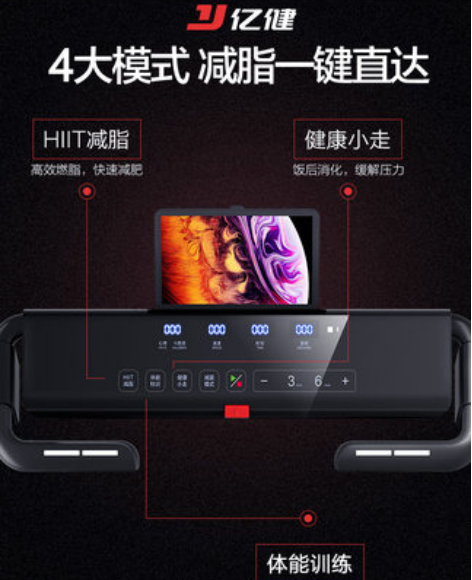 3、AI设想:亿健精灵Pro AI声控彩屏版的设想异常简练年夜方,根本造型和主流的跑步机差未几 ,然则在操控面板的设想上却加倍精细一些,采取 一整块弧面亚克力触摸屏,操控板上可以显示心率、卡路里、速度、时光、里程等信息。同时还有HIIT减脂、体能特训、健康小走、减震模式等便捷按钮,剩下的就是启动/停滞、加减速度等按键了。