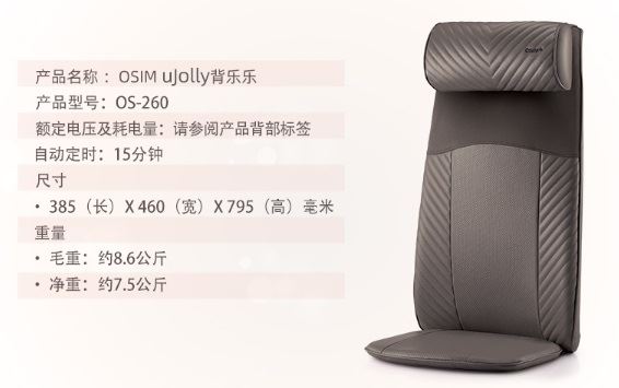 奥生os-260:3D拍颈椎腰背部按摩垫,4种自动按摩程序:肩颈舒缓、揉捏滚轮摆动按摩、腰部按摩、全背按摩。此外,您可以手动定制自己的按摩师。按摩前可以调整肩部位置,也可以根据自己的喜好选择按摩程序。双重推拿按摩,肩捏和腰部推拿。按摩垫经济适用,可用于家具和装饰风格。各种椅子都适合新飞行霸天虎。
