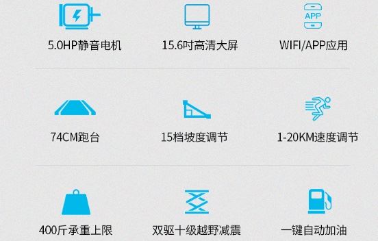 1、跑台:超宽的58cm宽广跑道,国际标准的8cm防滑边条,形成了74cm宽的跑台宽度。跑带每提高1cm,成本会提高200元,如加宽跑带,整机用料就越多,对马力要求也就越大,所以这款跑步机的造价比普通跑步机要高出很多,从而打造出的是一款真正的高端跑步机产品。