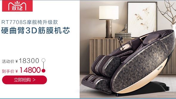 1、荣泰7708s——价格¥14800.00。SL型导轨+3D机芯按摩椅,气囊个数80个。搭载的2代3D智能机芯的按摩头可前后伸缩8CM,实现更深层次的按摩,还可根据人体背部曲线,自动调整按摩头伸缩量,按摩头为硅胶材质,弹性好、寿命长、柔软贴近人手。 背部是SL型超长导轨130CM从后脑勺直达大腿根部按摩,可6档调节按摩力度。