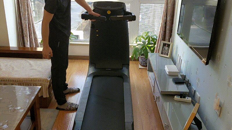 在跑步机的左侧有个扳手,用力往外拉,就可以把跑步机的机身撑起来了。同理,收纳的时候,可以把机身放下,立起来放在墙角就可以了,设计简单又合理。