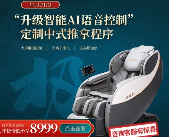 kgc进入国内市场以来,主打线上,线下没有实体店,虽是进口品牌,但是在国内有工厂,价格¥4880.00~19800.00,型号众多,按摩手法多样而先进,按摩技术已经达到世界一流水平。KGC产品质量高,返修率不高。
