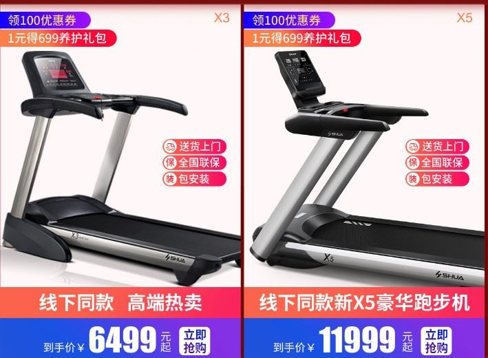 舒华X5豪华款:是舒华产品线顶级产品,马达持续输出功率2.5HP,动极其强劲,SUT双跑版减震,中间有一次层减震太空棉,减震效果非常突出,如果不差钱,又认准国产舒华这个品牌,X5绝对对得起这个价格~