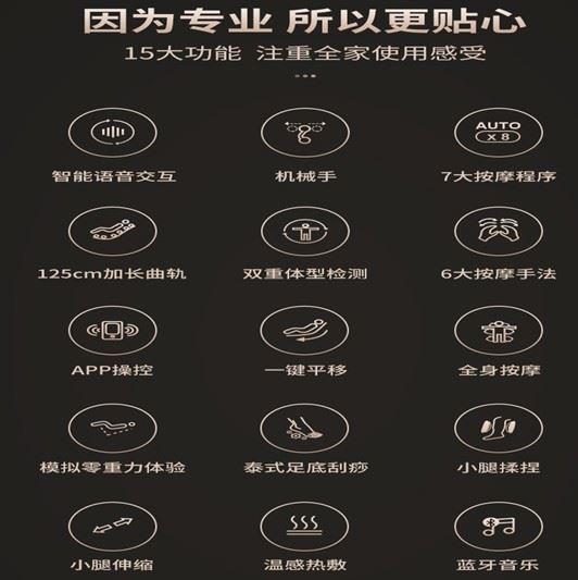 2、配置有全新2代3D智能按摩机芯,采用全新多层芯片,并且配置有三档宽幅自由调节功能,不管是怎么样身型的用户都可以调节到合适的按摩位置,同时还具有性能稳定和速度快等特点;还配置了127度仰躺零重力太空舱按摩功能,犹如漂浮在太空舱一般,带用户体验太空“失重”的按摩体验。