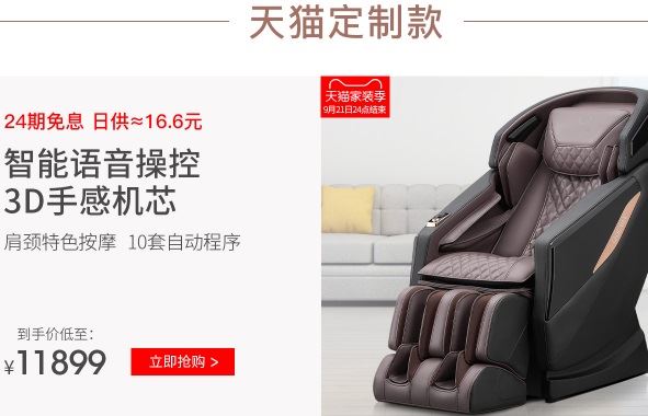 第三款:荣泰7709——价格¥24800.00,2-3万元以内性价比最高型号,SL导轨+3D机芯,控制方式为按键控制、语音,加热部位=小腿自动温控智能加热、腰部加热,智能类型=已连接天猫精灵,在线语音;