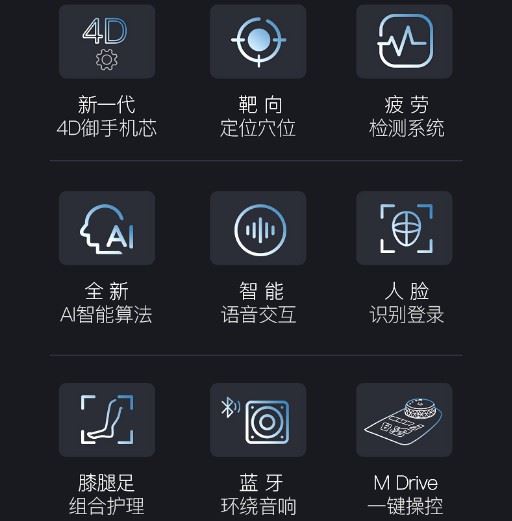 ? 4D机芯、SL型导轨、5档力度调节、60个气囊、疲劳检测系统、AI智能按摩计算