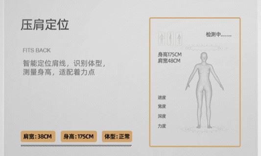 采用小机身造型搭配一键前滑设计,靠墙距离只需要12cm就可以,展开后占96同城地面积也只有约1.5平方米的空间;另外还配置有智能肩部检测功能,根据肩部位置检测,智能定位身体型态,为后续按摩提供更加准确的数据支持。