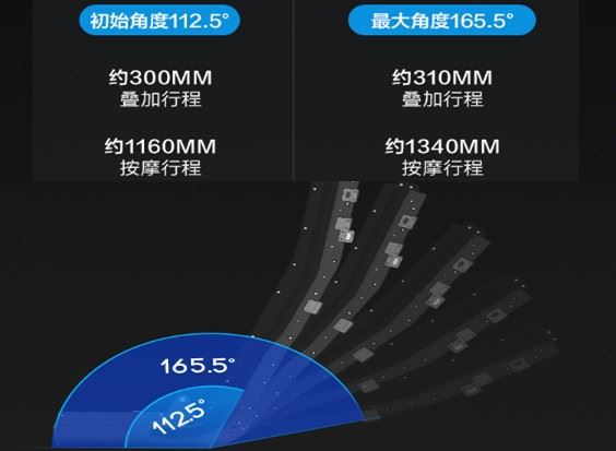 3、柔性导轨:采用业内领先技术自适应柔性导轨,专利号:CN207979981U,在躺倒按摩的过程中,能够有效增加导轨广度,按摩有效行程从116cm增加到134cm,再配合双机芯,让按摩从颈肩到大腿部的全覆盖,全面增强按摩的舒适度。