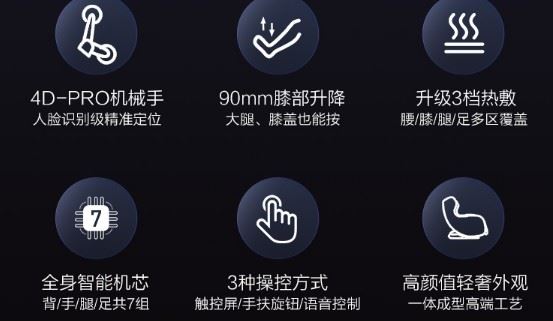 其次,该按摩椅由英国ROMH医学研究中心联合研发,内置由英国医学专家团队基于预防医学理论研制的电动按摩程序。同时还新增了人脸识别、语音识别、肌体疲劳感测、脊柱游走式加热等多项创新智能配置,为广大用户提供拥有医生大脑、推拿大师手法的按摩椅。