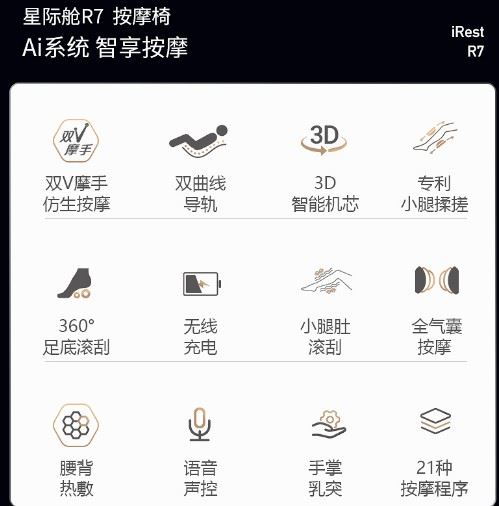 4、按摩程序:R7星际舱,飞船空间设计,结合不同人群需求,精心搭配21套自动按摩程序,实现多样化按摩方式的突破。