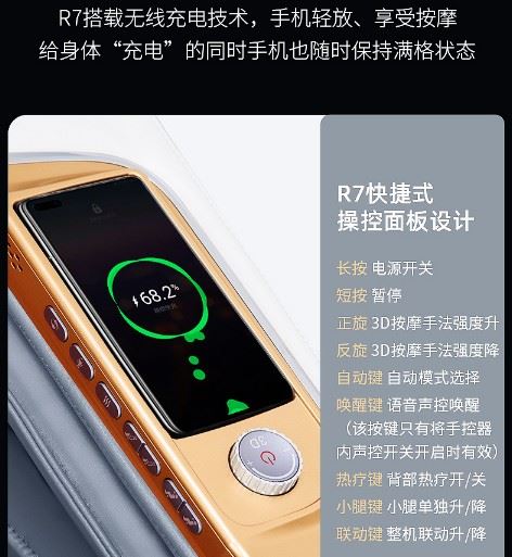 因此,R7星际舱在按摩技术上作了迭代革新,采用新型碳纤维加热技术,与其他按摩椅相比具有加热快、渗透深、温度均匀三大优势,同时将无线充电融入按摩椅的设计中, “按摩+娱乐”双重智能化 , 让用户能在有限的休闲时间里体会双倍的生活快感,崇尚居家空间休闲放松+娱乐一体化的生活方式。