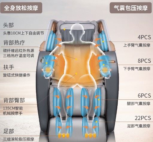 ·设有背部热疗功能:采?碳纤维为远红外热源,三档热疗温度调节。·靠背架下躺采?滑轨技术使靠背离墙始终保持零空间,最?限度节约空间?!た勘车脊觳?曲线导轨技术,完全贴合?体背部曲线,从头部致?腿都能享受贴?按摩?!?乐播放系统,左右太空舱内置3D数字?响。可利?智能设备的蓝?功能,进??线连接播放?乐。·设有智能语?声控识别功能。·右扶?上设有?腿升降键、靠背躺卧键、热疗键、负离?键、语?键、?动偷换王妃键、零重?键、开关(暂停)键、联动躺卧键等快捷键。·设有?腿架单独升降调节功能、靠背架单独升降和靠背架联动升降调节功能、零重?Ⅰ或零重?Ⅱ、定时调节功能?!?部设置?底滚轮按摩功能,三组滚轮滚动对脚指根部滚动按摩; 滚 对脚?和脚跟处动式刮痧按摩?!ぴ谧笥?掌?囊袋中,设有凸点按摩带及磁疗功能?!ど栌?腿揉搓功能:可缓解久站导致的?腿肌?僵硬或紧张?!ぷ蠓?前端 内设有USB充电功能。 ?控器放置槽·右侧太空舱处设置有负离瑞尔动物庄园?发?器?!づ渲肨FT彩屏?控器。·关机?动起坐功能,机械??动复位功能?!ね房康娌?两节(折回为两层)可折叠式设计,可以根据??的需要决定使?层数,以减轻颈肩部按摩?度;展开头靠垫延伸到背部,以减轻背部按摩的?度。适合不同的?使?可?由选择。