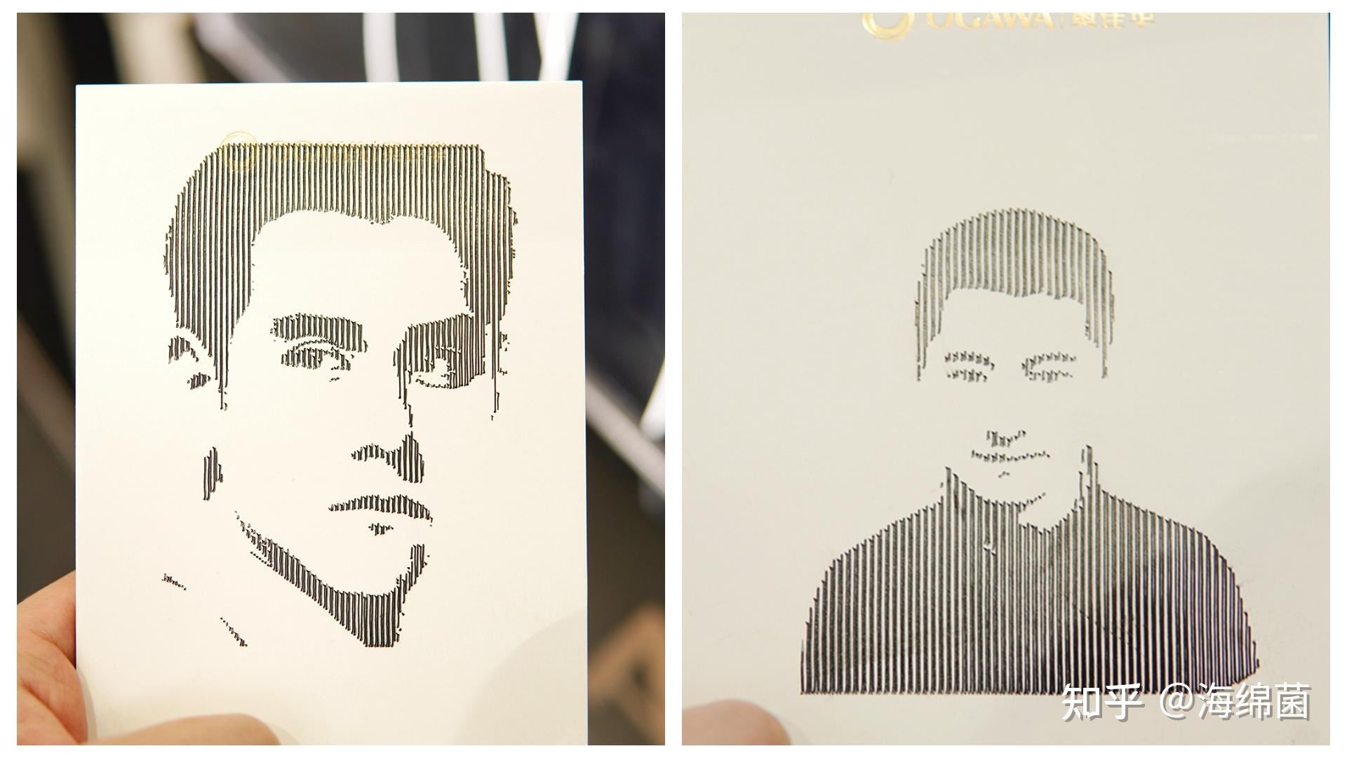 来看看按摩机芯的绘画成果,说实话还挺让人意外的,绘画的精细程度已经可以堪比3D打印了。同时绘画程序并非是事先预置的,下面右图是参观者现场拍照后,AI机芯再同步绘制的,实属真AI无疑了。