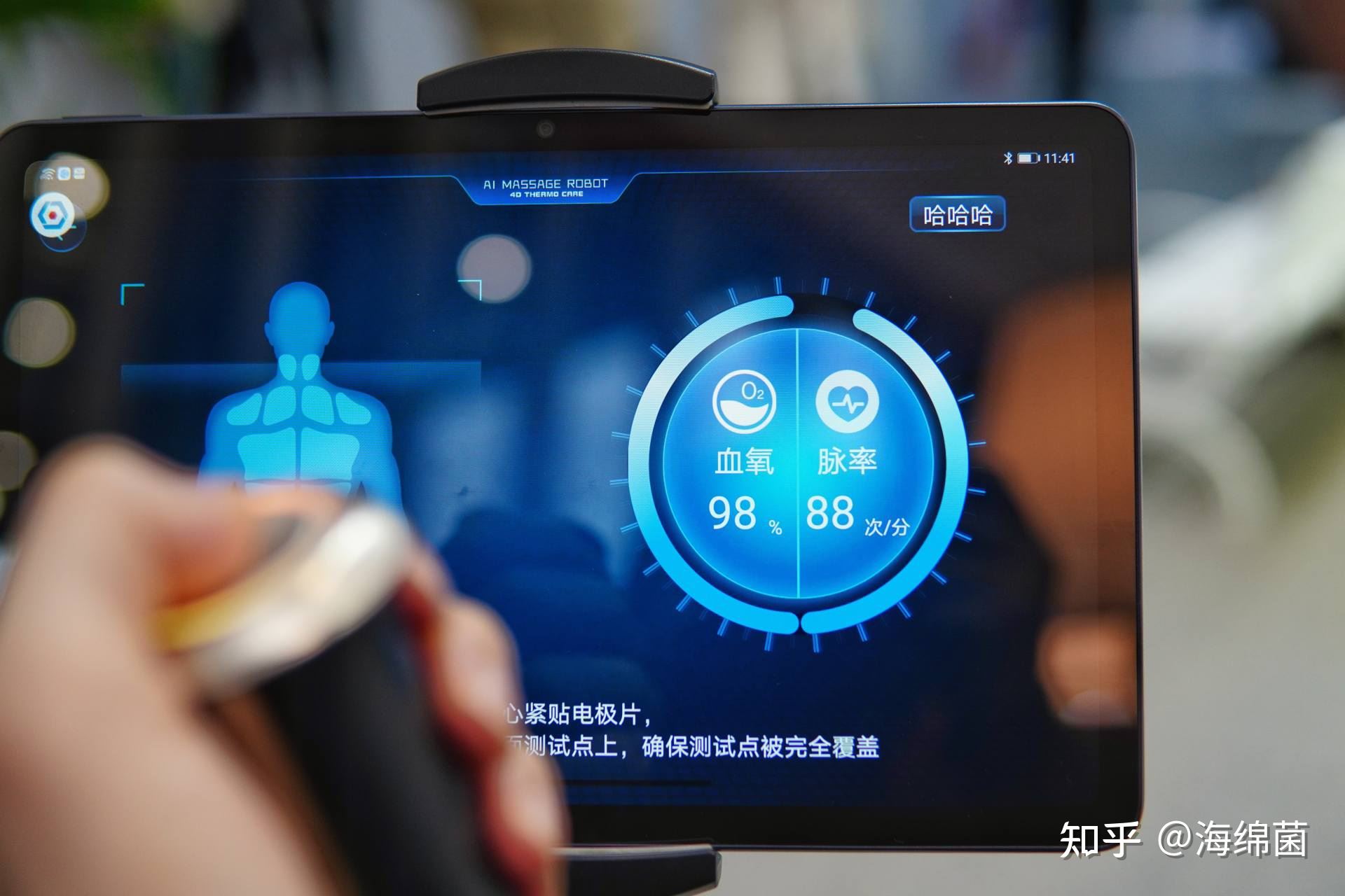 屏幕下方有个手柄吸引了的注意,现场工作人员告诉我,这就是这款按摩椅的核心优势之一:疲感追踪科技。使用前只需要智能检测一下,就能测得9大生理参数,通过AI的智能算法细化分析之后,给出私人订制的按摩模式。