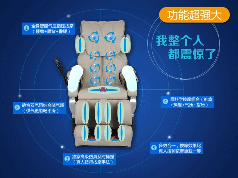 气囊是按摩椅种导轨到不了的地方,就用气囊的增压减压来达到按摩的效果;气囊主要分布在小腿、手臂、肩部、臀非诚勿扰陈菊部等等位置,这些事机械手够不到的地方,然后就用气囊来代替机械手按摩。