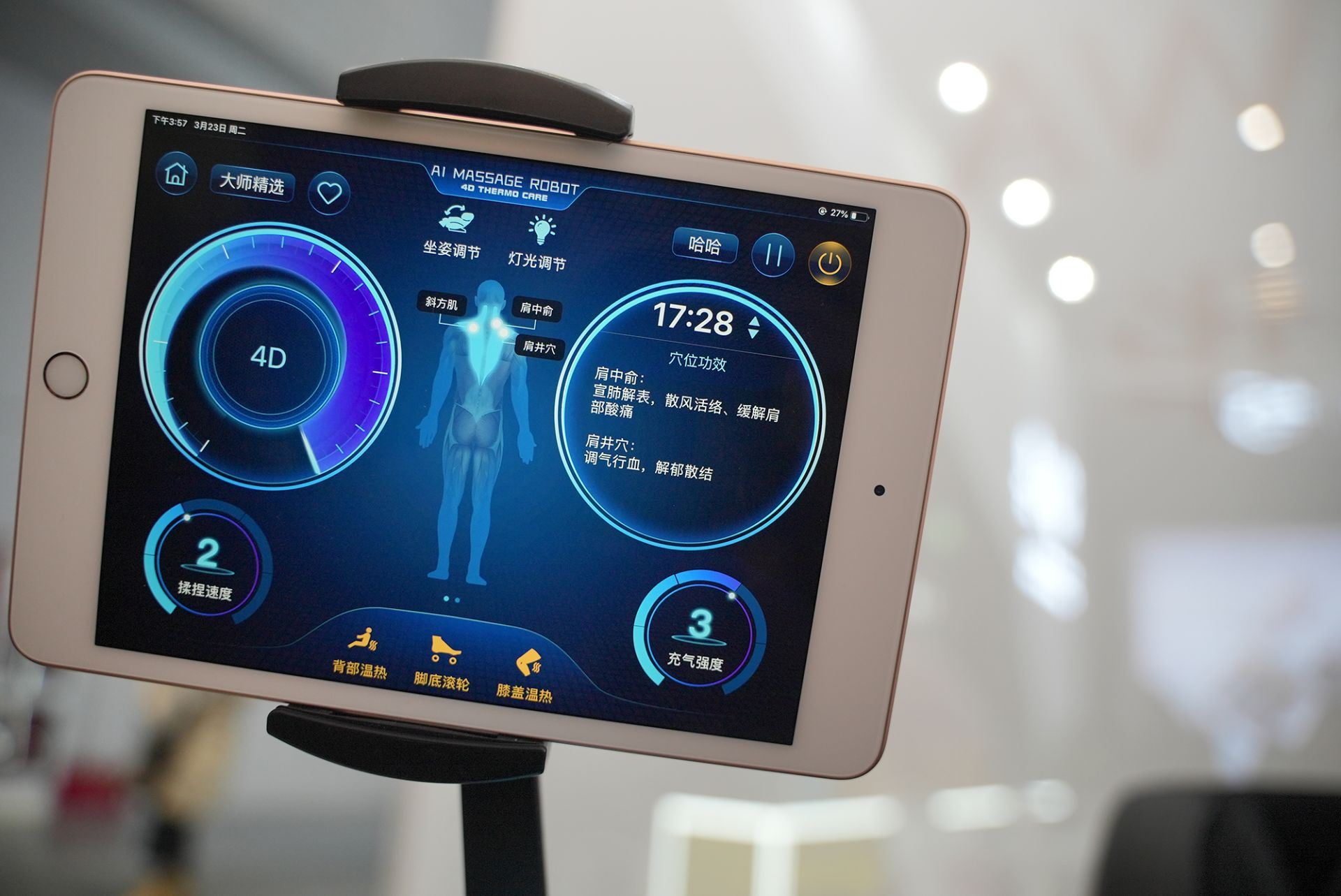 在展台的其中一侧有互动区域,这里陈列着一台设备,可以直观看到奥佳华按摩椅机芯的运动,通过识别图像可以通过机芯来进行作画,这样你们应该了解他们家的按摩椅机芯有多精准了。
