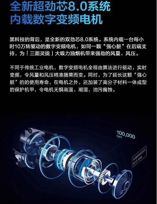 40°的拢烟翼夹角设置也是花了心思的,可以最大程度阻断油烟侧逃。当然,拢烟设计做得好没有大吸力也是无用的,吸力主要由风量(静压为零时油烟机单位时间的排风量)和风压(排风量达到7m/min的静压值)决定。