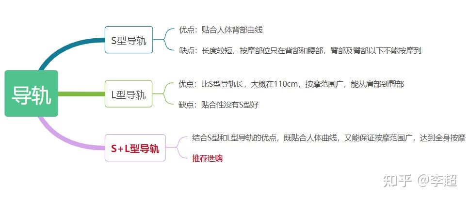 导轨是承载机芯运动轨迹的,主要按摩部分是上半身,分为无导轨,S型,L型以及SL型。